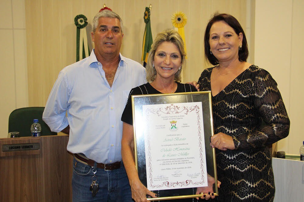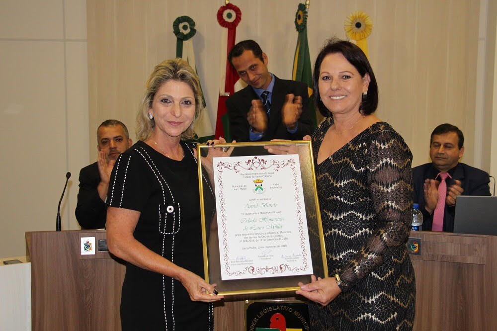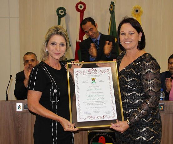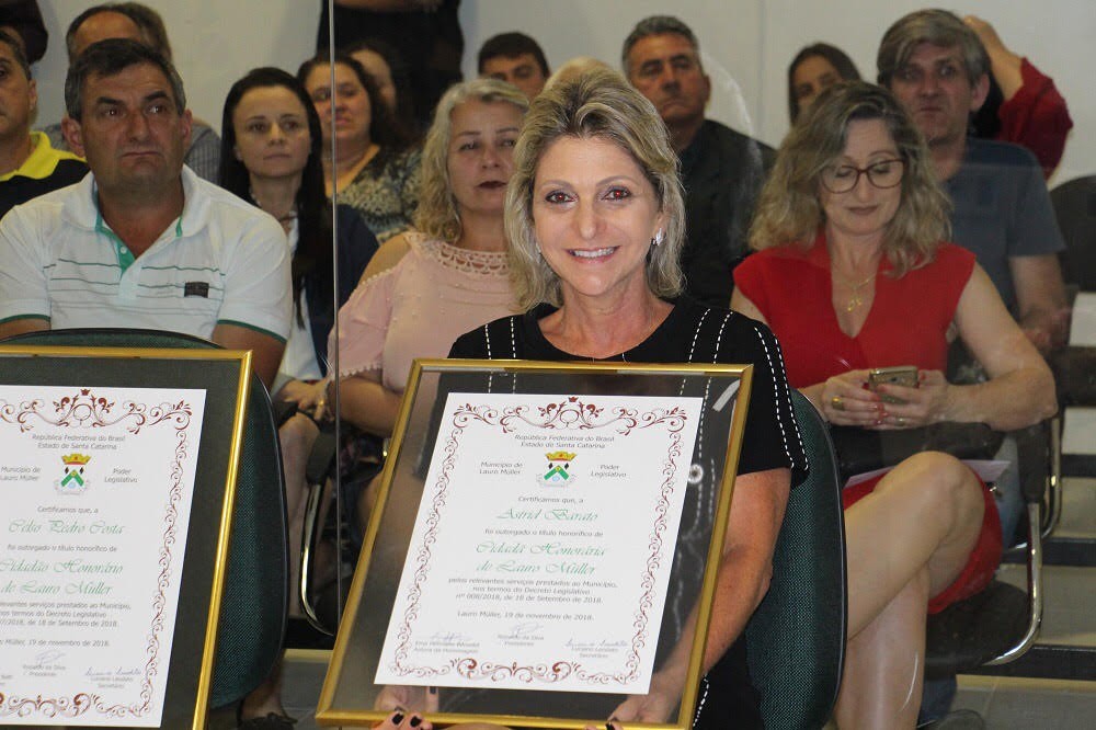 NA NOITE DESTA SEGUNDA-FEIRA, DIA 26, A CÂMARA DE VEREDORES DO MUNICÍPIO, EM SESSÃO SOLENE, HOMENAGEOU A ADMINISTRADORA DA EMPRESA, SENHORA ASTRID BARATO COM O MERECIDO TÍTULO DE CIDADÃ HONORÁRIA DE LAURO MÜLLER.