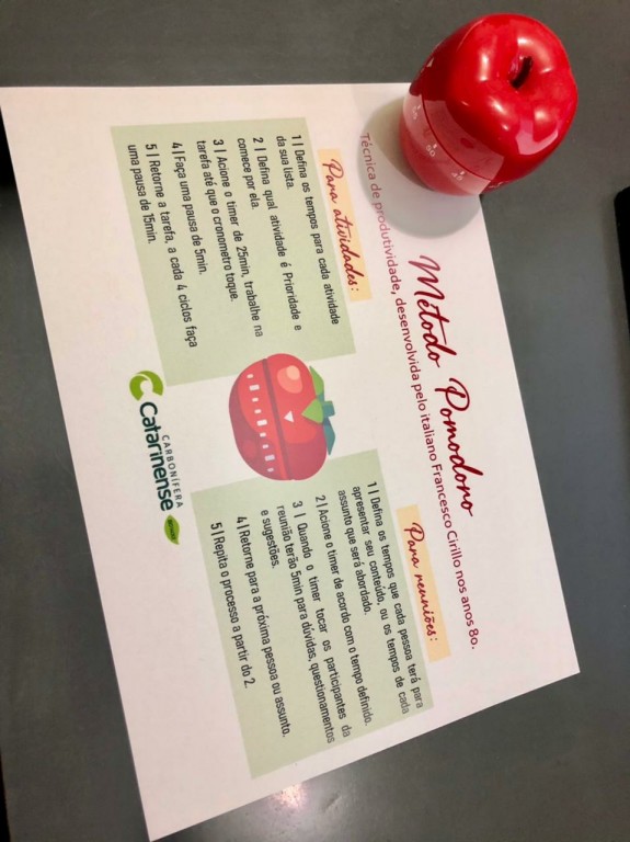Em um mundo cheio de distrações, manter a produtividade é um desafio. O que você tem feito para dar conta de suas atividades sem desperdício de tempo? Aqui na Carbonífera Catarinense estamos usando o Pomodoro, uma técnica italiana para gerenciamento de tempo. Francesco Cirillo, o criador do Pomodoro, defende que se dividirmos o trabalho em períodos de 25 minutos com pequenos intervalos entre eles, seremos mais produtivos. O nome da técnica vem do cronômetro em formato de tomate que o próprio Cirillo usava para estudar.