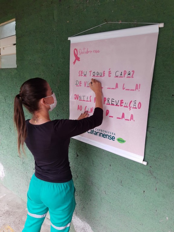 Conscientizar e integrar. Estes foram os objetivos principais da Carbonífera Catarinense Ltda com a atividade realizada com as mulheres da empresa em referência ao Outubro Rosa. Com uma divertida atividade que envolveu o sorteio de prêmios, as profissionais da CCL foram convidadas a estar na área rosa para o desafio de completar frases relacionadas à prevenção de câncer de mama. Mais que conscientizar, a ação teve o intuito de promover a integração entre as mulheres e fazê-las perceber que, com união, desafios são melhor enfrentados e que, dentro daquele ambiente, elas podem ter liberdade para falar sobre seus problemas.