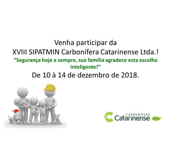 DE 10 A 14 DE DEZEMBRO, COM O TEMA “SEGURANÇA HOJE E SEMPRE, SUA FAMÍLIA AGRADECE ESTA ESCOLHA INTELIGENTE” A CARBONÍFERA CATARINENSE INICIA A SUA XVIII SIPATMIN, SEMANA VOLTADA PARA A PREVENÇÃO DE ACIDENTES DE TRABALHO NA MINERAÇÃO.