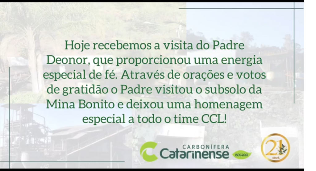 VISITA ESPECIAL NA MINA BONITO Na manhã de ontem (17/09/2020) o Padre Deonor visitou o subsolo da Mina Bonito, através de orações foi abençoando nosso ambiente de trabalho, máquinas, instalações e principalmente a vida dos profissionais.